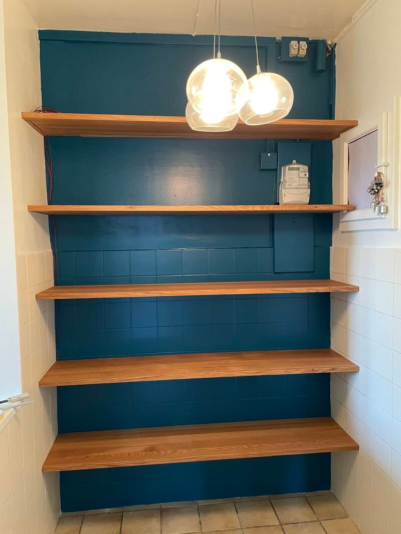 Bibliothèque et rangements divers pour l'habillage de la partie technique de chauffage au sol de la maison